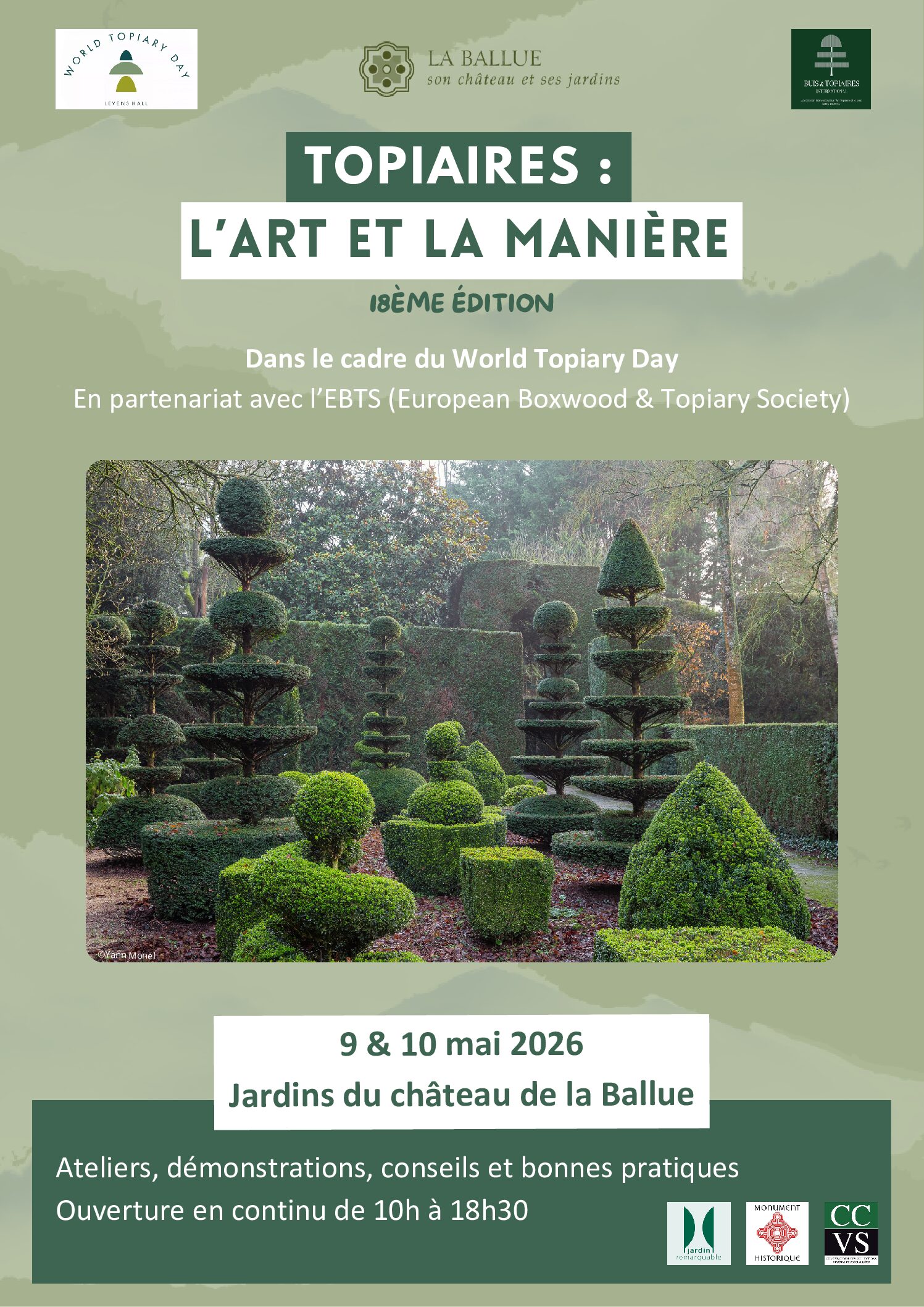 - Topiaires, l’art et la manière les 9 et 10 mai 2026, 18ème édition : le grand événement jardinier de la Ballue, avec démonstration d’art topiaire à découvrir ici. En partenariat avec l’EBTS, l’European Topiary and Boxwood Society, dans le cadre du World Topiary Day.